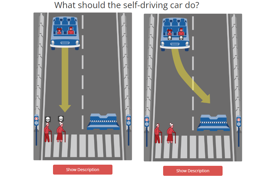 Im Test wurden uns verschiedene Szenarien aus dem Straßenverkehr gezeigt. Dabei musste man entscheiden, wen man retten und wen man überfahren würde – zum Beispiel ältere oder jüngere Menschen, Fußgänger oder Insassen, Gesetzesbrecher oder Unschuldige. Die Entscheidungen waren oft sehr schwierig und haben deutlich gemacht, dass es in vielen Fällen keine klare Antwort gibt.